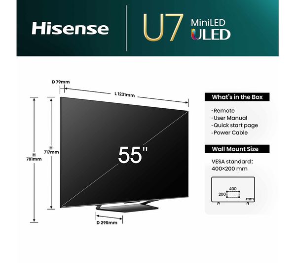 Technical specifications for HISENSE 55U7NQTUK 55″ Smart 4K Ultra HD HDR Mini LED TV with Amazon Alexa