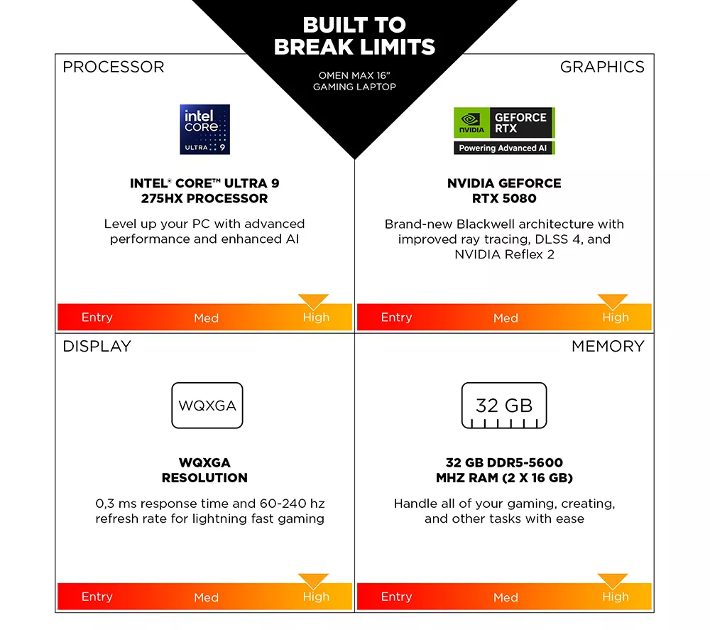 Technical specifications for HP OMEN MAX 16-ah0500na 16″ Gaming Laptop – Intel® Core™ Ultra 9, RTX 5080, 1 TB SSD