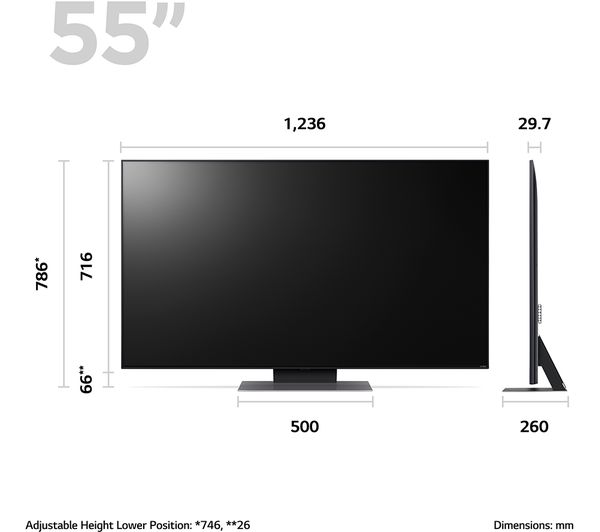– TV with stand: 746 x 1236 x 260 mm (H x W x D)
