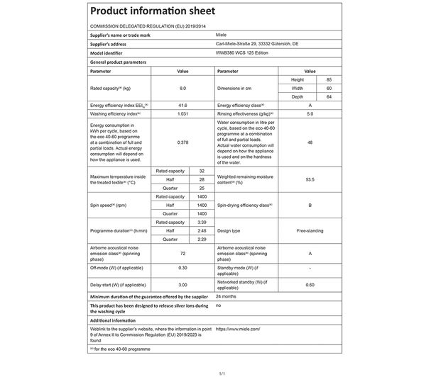 Technical specifications for MIELE W1 PowerWash WWB380 WiFi-enabled 8 kg 1400 Spin Washing Machine – White