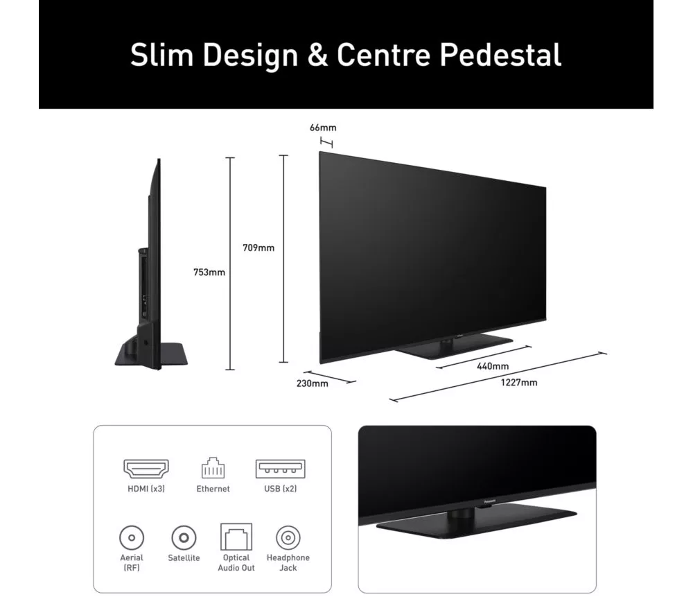 – TV with stand: 709 x 1227 x 66 mm (H x W x D)