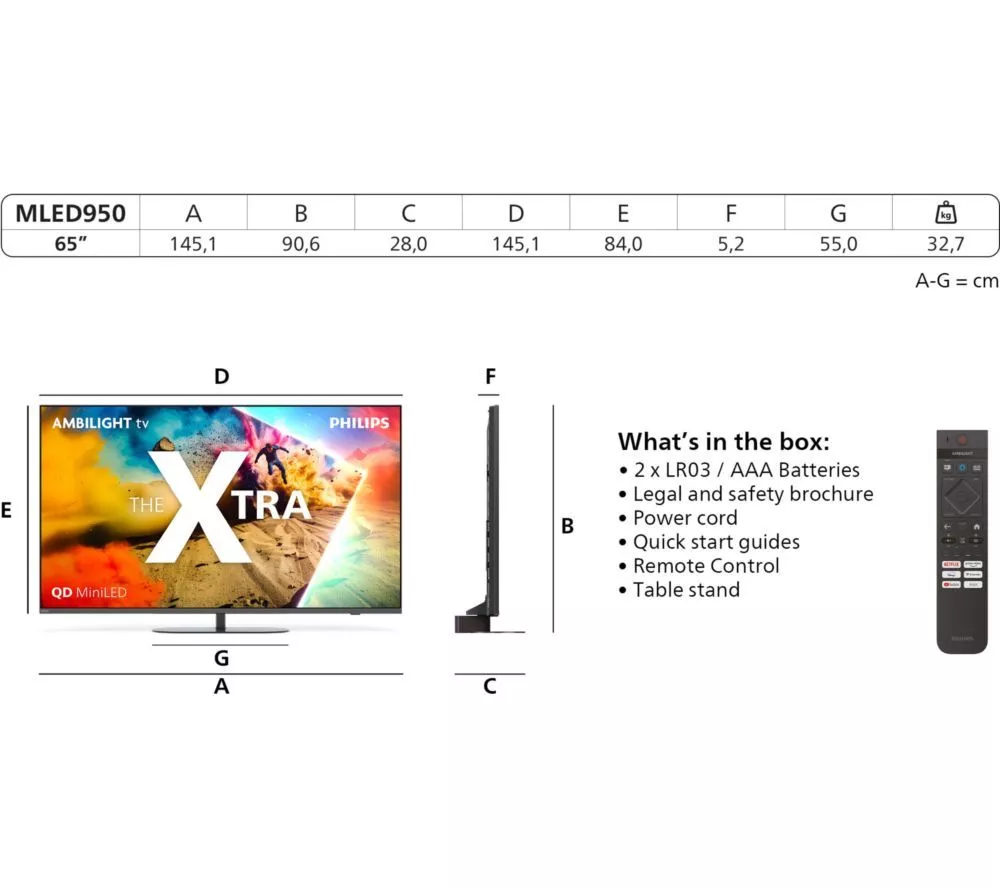 Technical specifications for PHILIPS The Xtra MLED950 65″ QD-Mini LED 4K HDR Ambilight Smart TV with Freely – 65MLED950/12